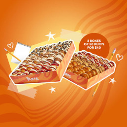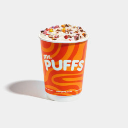 In addition to their puffs, Mr. Puffs Delson also offers a range of beverages including the Coffee Crisp Supreme Milkshake, Loux Lemon Iced Coffee, and a Small Hershey's Hot Chocolate. For those looking for an extra sweet touch, don't miss out on their Skor topping option to add to your order.
